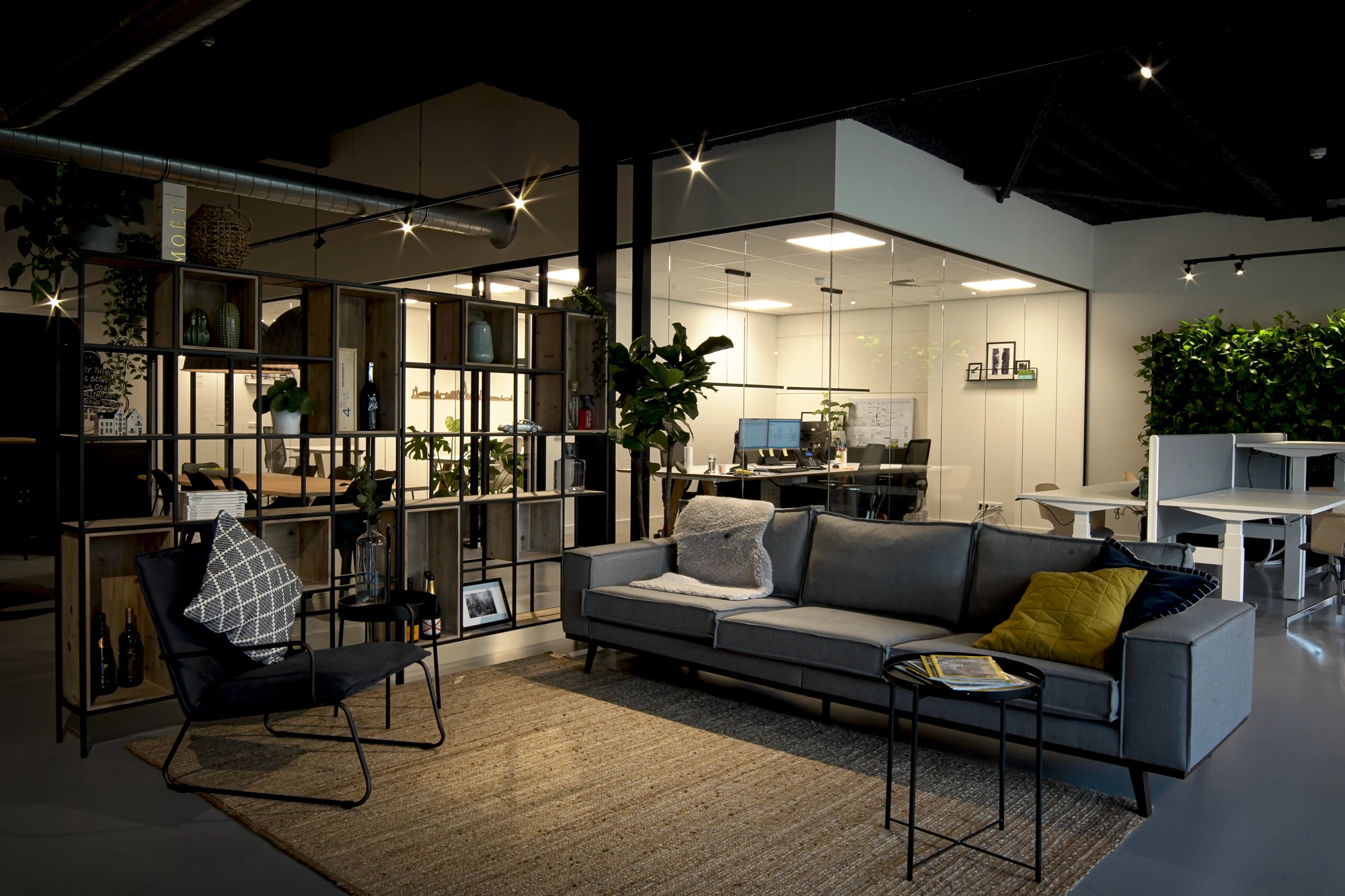 Strategisch geplaatste planten brengen een huiselijke sfeer, verbeteren het binnenklimaat en dragen bij aan een prettige en gezonde werkomgeving.