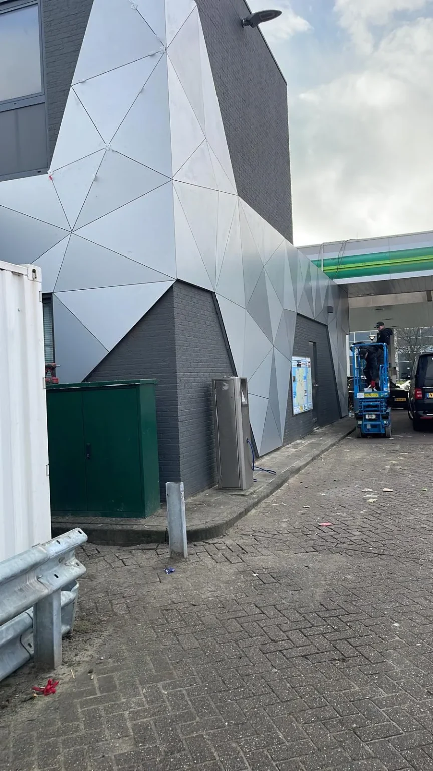 Voor BP in Den Haag verzorgde LUDEC de complete bouwkundige afwerkingen. Aan de buitenzijde werd hoogwaardige trespa gevelbekleding toegepast, volledig uitgewerkt van 3D-tekening tot productietekening, prefab geleverd en genummerd voor snelle montage. Binnen realiseerden we de volledige afbouw en afwerkingen, met een design dat direct opvalt zodra je het tankstation binnenstapt. Dat geldt ook voor de buitenzijde, wie er weleens in Den Haag is geweest denkt, ja dat tankstation ken ik zeker!